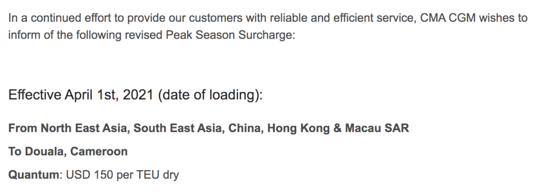 從以上國(guó)家和地區(qū),至美國(guó)以外的任何目的地的收費(fèi),于3月22日(提單日期)起生效;至美國(guó)的收費(fèi),于4月20日(提單日期)起生效。