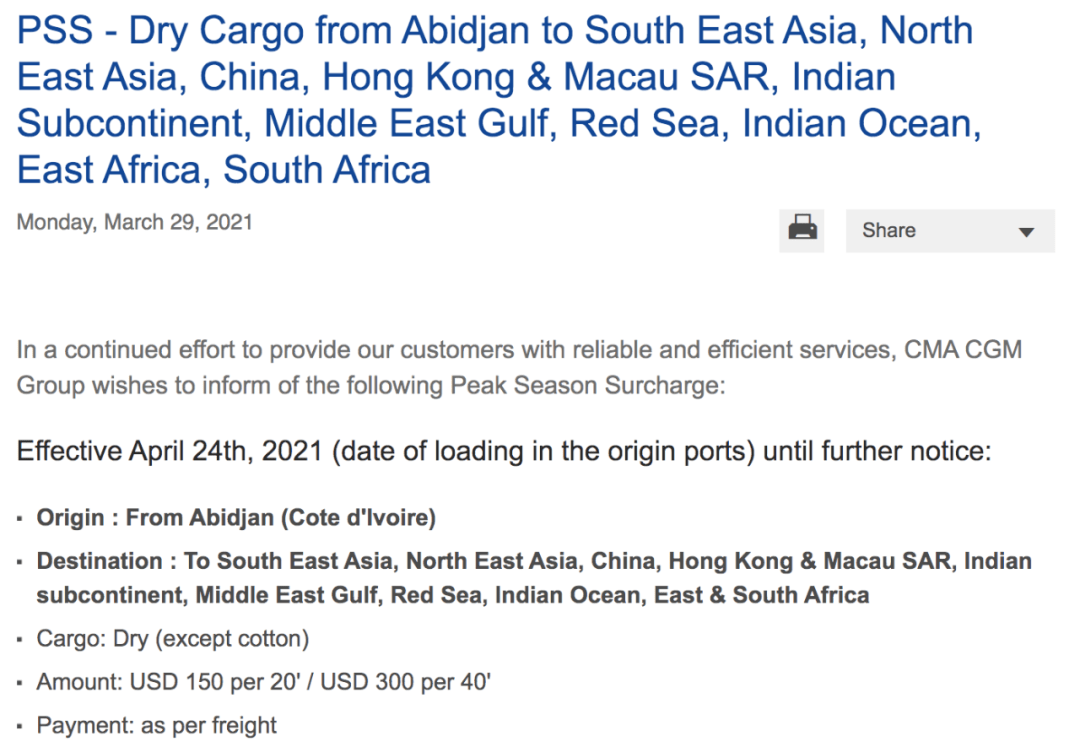 另?yè)?jù)達(dá)飛發(fā)布的最新公告,在從科特迪瓦(阿比讓)出發(fā),至東南亞、東北亞、中國(guó)大陸、中國(guó)香港、中國(guó)澳門、印度次大陸、中東海灣、紅海、印度洋、東非以及南非的航線上,征收PSS,適用于干貨集裝箱(棉花除外)。
