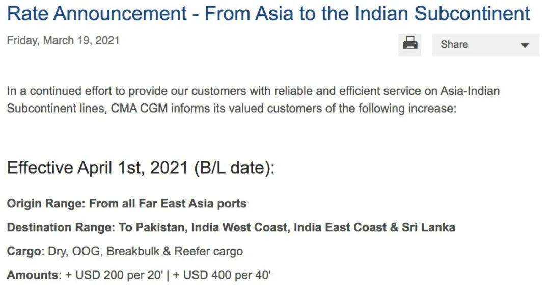 達飛日前發(fā)布公告稱,為保證遠東到印度次大陸航線的準班率,上調(diào)從遠東地區(qū)的亞洲港口,到巴基斯坦、印度西海岸、印度東海岸和斯里蘭卡航線的運費,上調(diào)幅度為200美元/TEU、400美元/FEU。