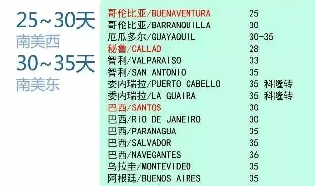 南美航線屬于比較片原價(jià)的一帶,因受洋流的影響,一般為25-30天,東部航線因?yàn)樾枰@行,則需要30-35天。