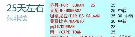 非洲航線是經(jīng)典的老航線了,所以相當(dāng)于其他地方,非洲雖然遠(yuǎn),但是東部港口基本都在25天左右。